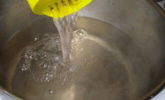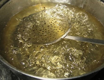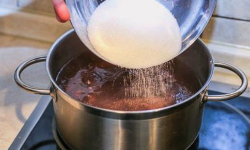 - Giet vervolgens het afgekoelde water in een diepe bak, vul met suiker en breng de inhoud aan de kook. Voeg na het uitschakelen van het vuur citroenzuur toe en roer goed.