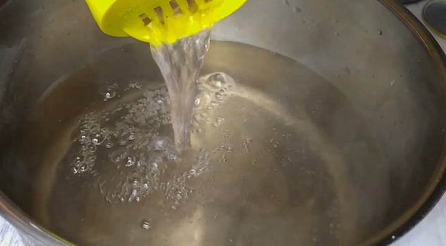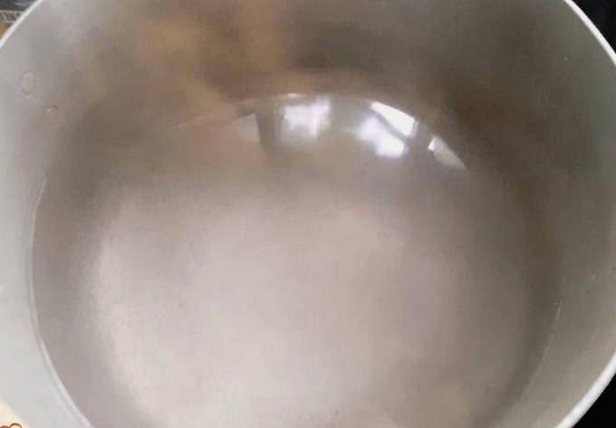 - Vul de volledige inhoud met kokend water en laat volledig afkoelen onder een gesloten deksel. Later veranderen we het deksel en gieten al het afgekoelde water in de pan.