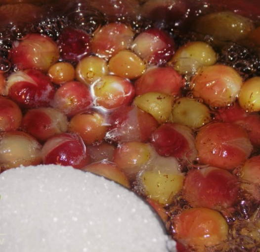 - Giet na deze tijd kristalsuiker in een pan met druiven en roer goed.