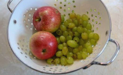 - We zullen een pot van drie liter en de benodigde ingrediënten voor het maken van compote bereiden. We wassen de druiven en verwijderen ze van de takken, in een poging de bessen zelf niet te vervormen. We wassen en drogen de appels gewoon.