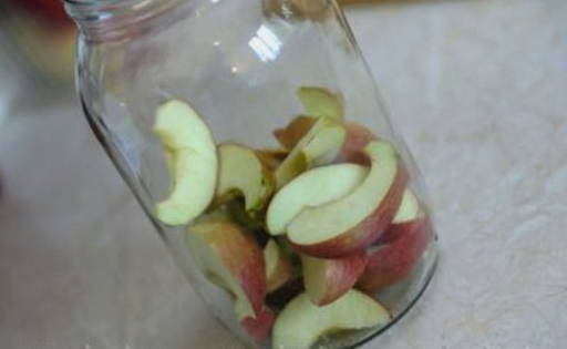 - Het steriliseren van de blikjes is een belangrijke stap. Nadat we ze hebben voorbereid, beginnen we met het opmaken van alle componenten. De eerste laag is appels.