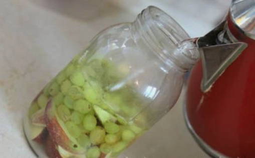 - Giet onmiddellijk kokend water in een pot met een klein stroompje zodat alle componenten volledig bedekt zijn met water en verwarm de peren met druiven gedurende 20 minuten, totdat het water niet volledig is afgekoeld.