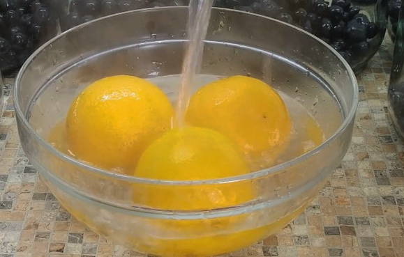 - Voeg oranje borden toe aan de druivenpotten. Giet overal de benodigde hoeveelheid suiker over en overgiet alles met kokend water.