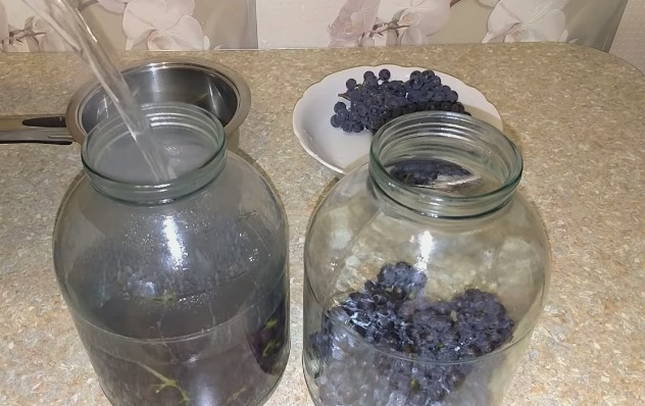 We gieten kokend water in potten met druiven en proberen het in het midden van de pot te gieten zodat de muren niet barsten. En we laten de bessen 15 minuten opwarmen en bedekken ze met deksels.