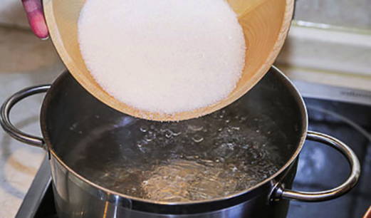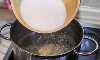 - Giet vervolgens het water terug in de pan en breng opnieuw aan de kook. Giet suiker in de pot.