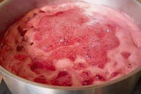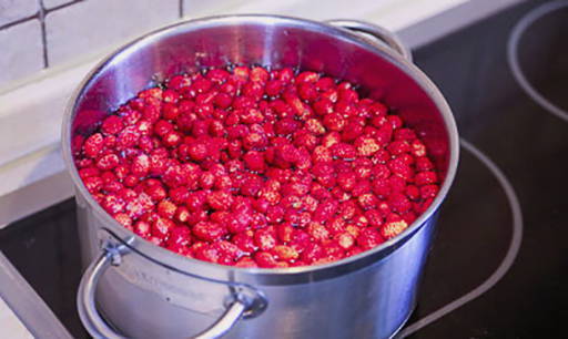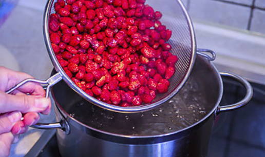 Giet de bessen in een pan met hete siroop.