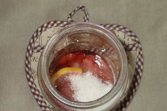 - Giet water in een pan en kook het. Doe bessen en citroen in een gesteriliseerde pot van drie liter.