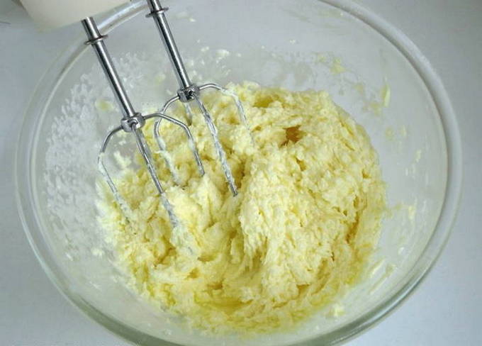 - De zachte boter wordt ingewreven met suiker totdat de zoete korrels verdwijnen. Doe dan de dooier in de massa.