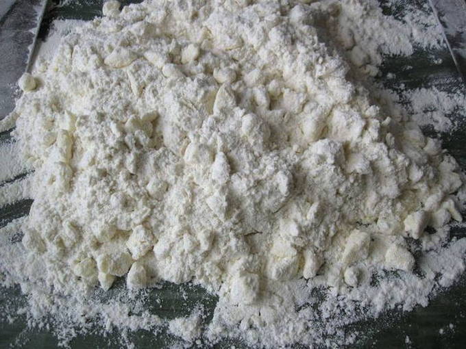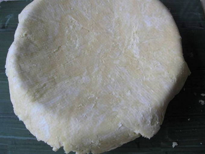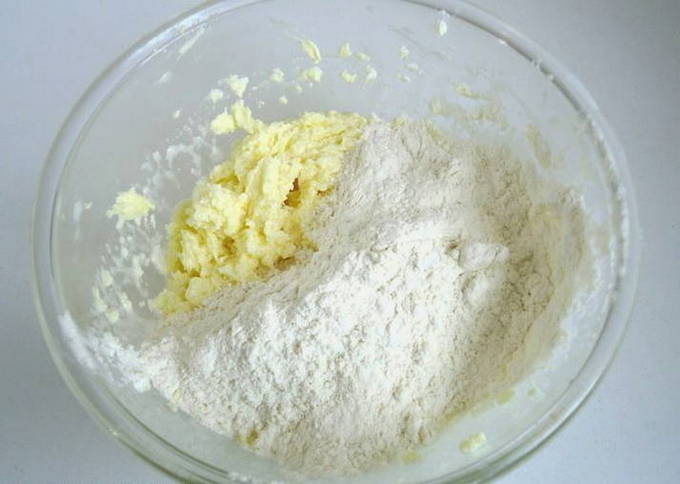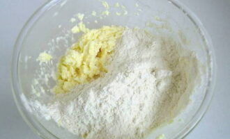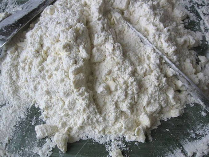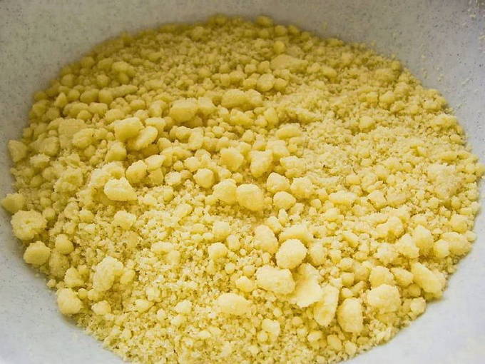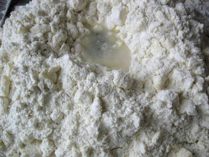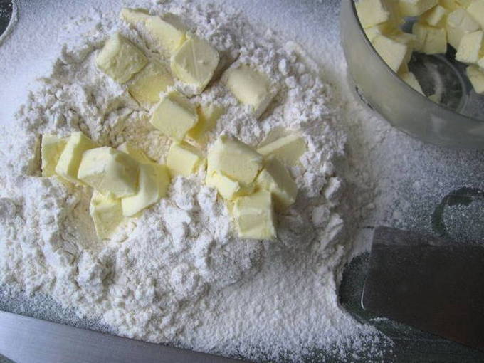 - Voorgezeefde bloem wordt gemengd met zout en in blokjes gesneden boter. De massa wordt gehakt met een mes om een grote kruimel te maken.