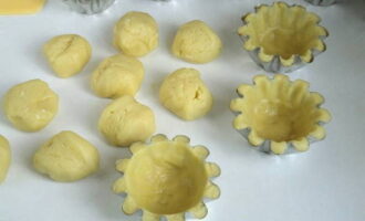 - Vervolgens wordt het deeg in porties verdeeld, elk wordt uitgerold en voorzichtig over de bakvormen voor bakmanden verdeeld. Een lading in de vorm van bonen of erwten wordt in het midden gegoten, zodat de manden niet opzwellen tijdens het bakken. Maak bovendien van een deel van het deeg doppen voor toekomstige eiwitpaddenstoelen voor het decoreren van cakes.