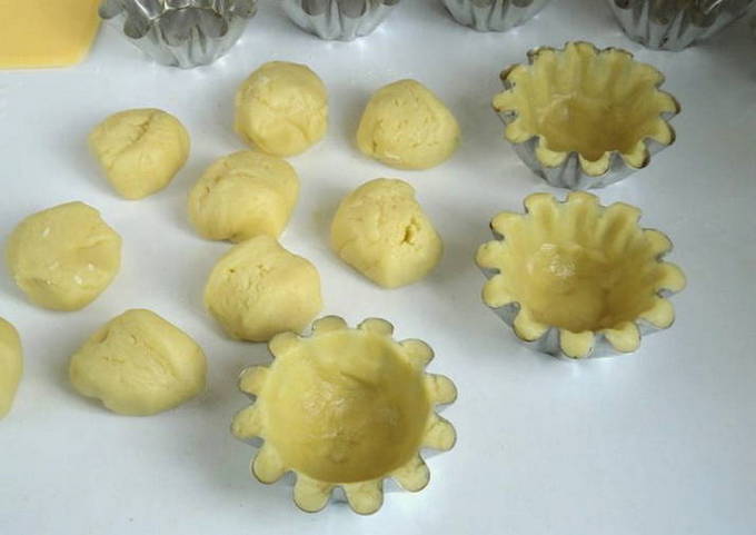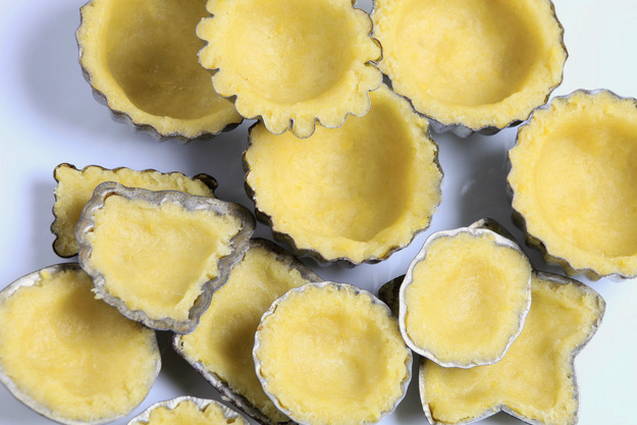 Elk stuk wordt uitgerold en in een mal geplaatst, geprikt langs de hele omtrek. Bak de manden 15 minuten op 180 graden in de oven.