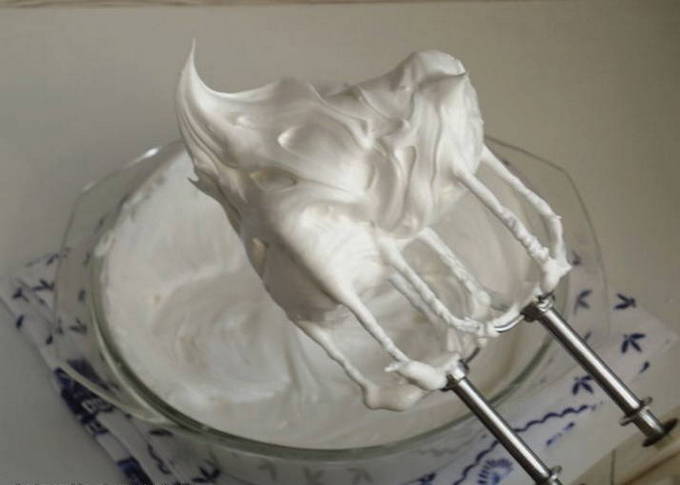 - Klop het eiwit tot een stabiele luchtige massa en voeg voorzichtig, beetje bij beetje, de siroop toe aan de eiwitmassa. Blijf de room kloppen tot hij stevig en glad is.