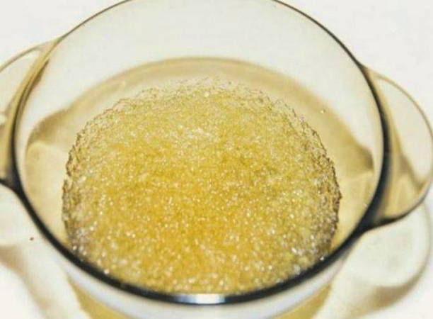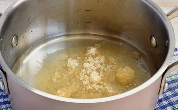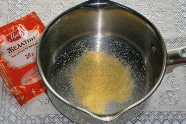 - Breng water aan de kook in een pan, laat het iets afkoelen en voeg voorzichtig de inhoud van de geleizak erin. Roer goed en laat afkoelen tot kamertemperatuur, maar laat niet uitharden.