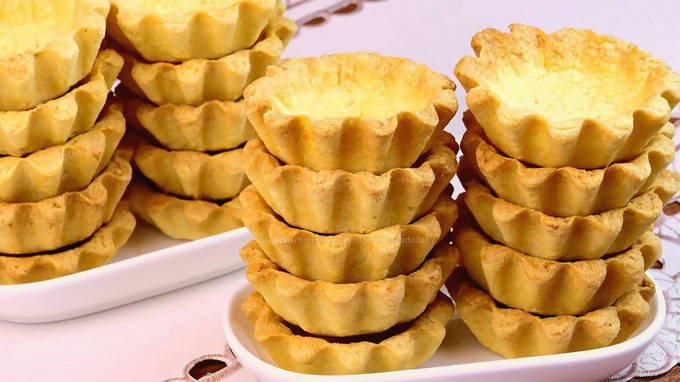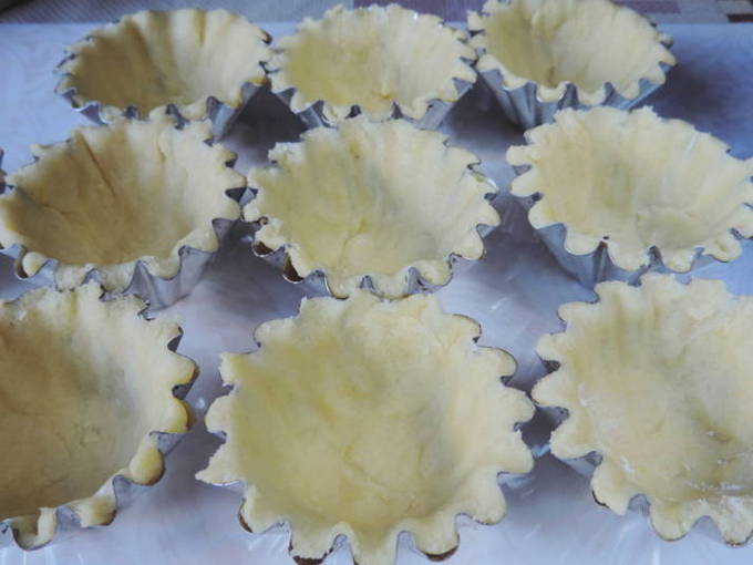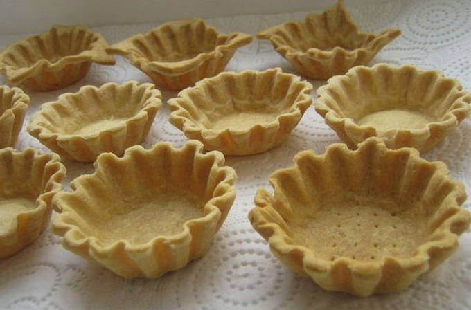 - Het deeg is verdeeld in 6 delen, elk wordt uitgerold en verdeeld in bakvormen. Je kunt het deeg fijnhakken met een vork of losse producten - bonen of erwten - in het midden van elke vorm doen, zodat het mandje wordt gevormd als het onder belasting wordt gebakken. Bewaar in een hete oven tot ze gaar zijn - 15 minuten.