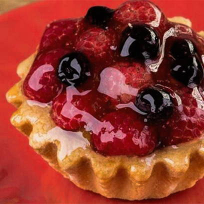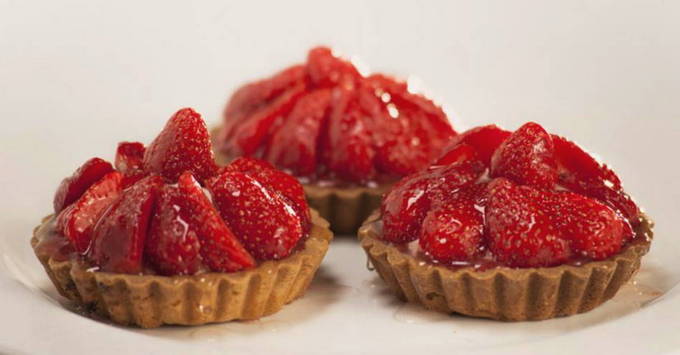 - De vulling wordt in gekoelde zandmanden gelegd en nog 8 minuten in de oven gestuurd. Bovenop worden de afgewerkte producten bestrooid met poedersuiker en versierd met muntblaadjes en verse bessen.