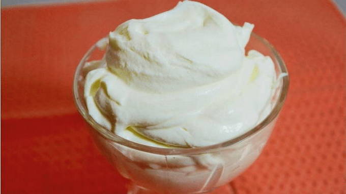 - Om de room te bereiden, moet je de vette kwark, zure room, zetmeel en kristalsuiker met een blender kloppen.