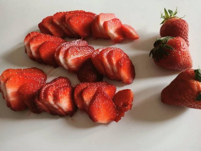 - Was de aardbeien, droog en snijd grote bessen in stukjes.