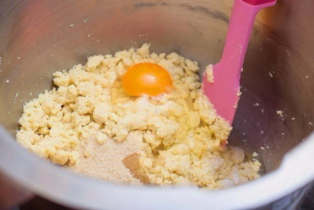 - Voeg het ei toe en kneed het deeg snel.Het is belangrijk om de ingrediënten snel te mengen, zodat het zandkoekdeeg niet ruw en taai wordt. Het deeg wordt in folie gewikkeld en een half uur in de kou geplaatst.