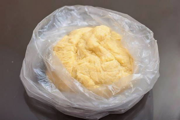 - De dooier wordt aan de massa toegevoegd, goed en snel gemengd en het deeg 15 minuten in de koelkast, afgedekt met folie.
