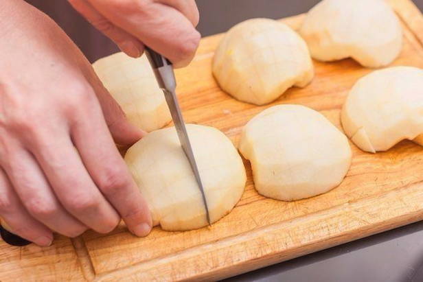 - Geleidelijk wordt bloem aan de massa toegevoegd, evenals frisdrank geblust met citroensap of azijn. Het deeg wordt gekneed, in porties verdeeld, uitgerold en in vormen voor bakmanden geplaatst. Het is belangrijk om het deeg rond de omtrek te hakken, zodat het niet opzwelt.