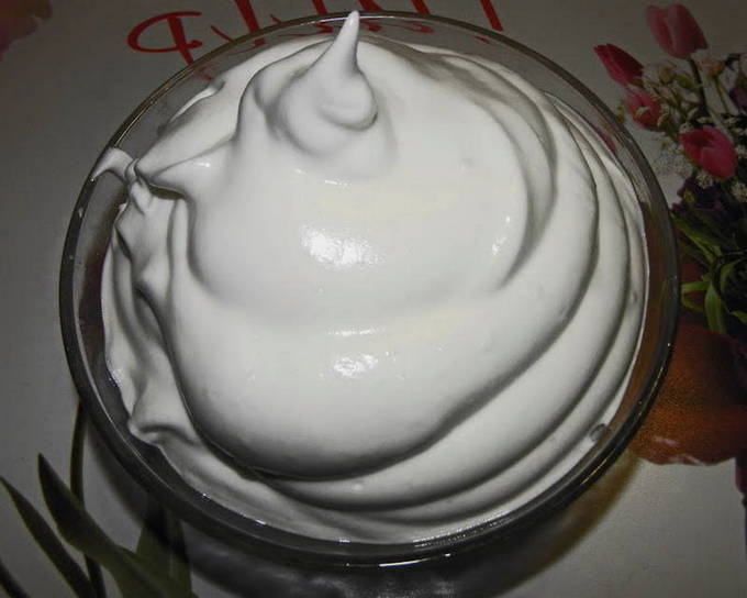 Water wordt verwarmd in een pan en eiwitten, citroenzuur en suiker worden gemengd in een stoombad in een container. Kook de massa ongeveer 15 minuten op een stoombad tot ze dik is en breng de room dan over in een spuitzak.