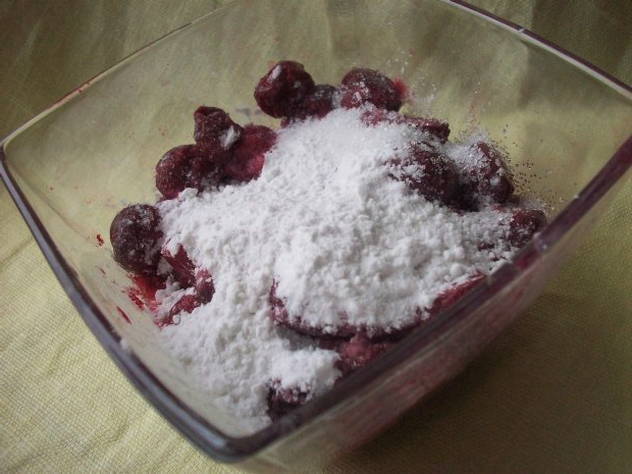 - Knijp de kersen lichtjes uit, bestrooi met 1 eetl. suiker en zetmeel en kook onder voortdurend roeren op laag vuur gedurende ongeveer 10 minuten om de massa iets dikker te maken.