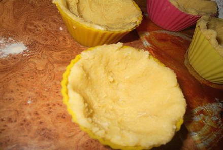 - Het deeg wordt uitgerold tot een dikte van 3 mm, er worden cirkels uitgesneden, geschikt voor de diameter van de vormen voor manden, de blanco's worden erin geplaatst en met een vork geprikt zodat ze niet opzwellen tijdens het bakproces. De vormen met het deeg worden nog 10 minuten in de koelkast bewaard en vervolgens 10 minuten in de oven op 170 graden geplaatst.