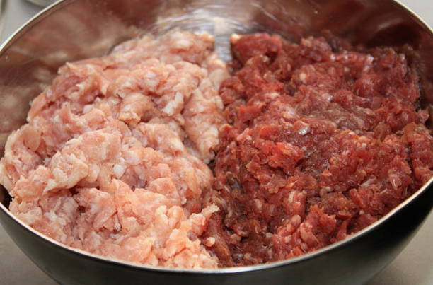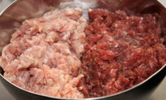 - Doe het gehakt en varkensvlees in een grote kom. Beide vleesproducten moeten vooraf worden ontdooid.