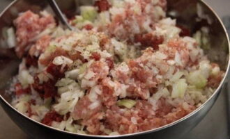 Ontdooi varkensvlees en rundergehakt van tevoren. We doen beide producten in een gemeenschappelijke kom.