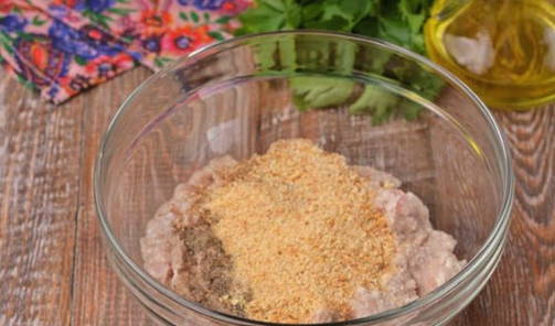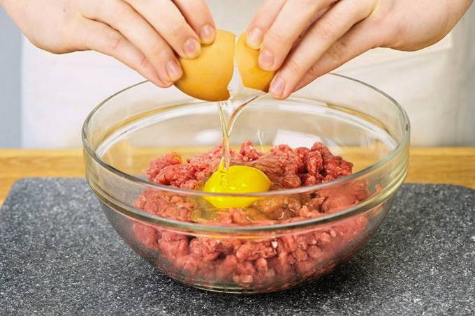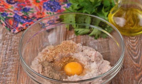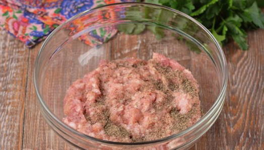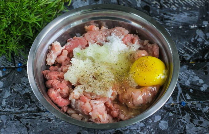 - Voeg zout, kruiden en een kippenei toe aan het varkensvleesproduct.