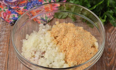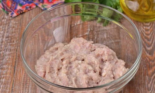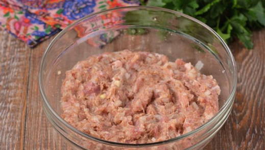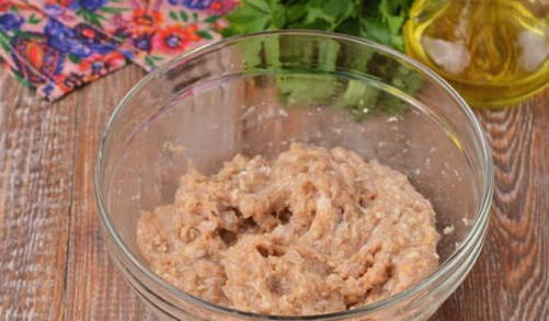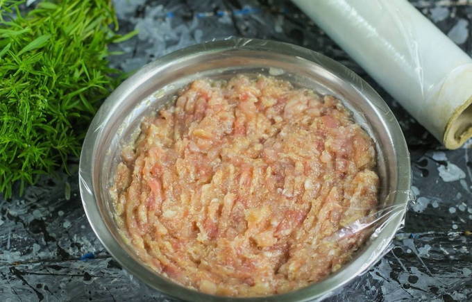 - Doe het ontdooide gehakt in een aparte kom. Voeg de pulp van een brood, gemalen peper en zout eraan toe. Kneed de massa met je handen tot een gladde massa.
