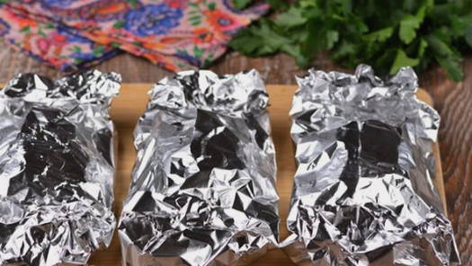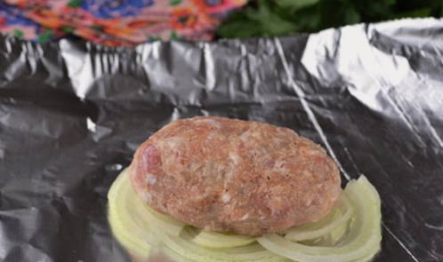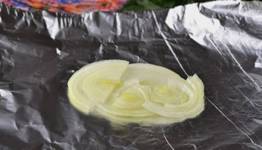 - Snijd de tweede ui in cirkels. We leggen ze op stukjes folie.