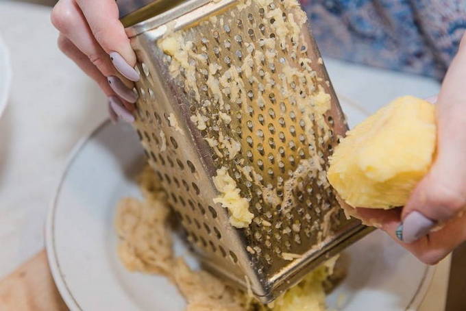 - Schil vervolgens de aardappelen en maal ze met een fijne rasp. We persen de resulterende pap uit overtollig sap.