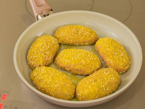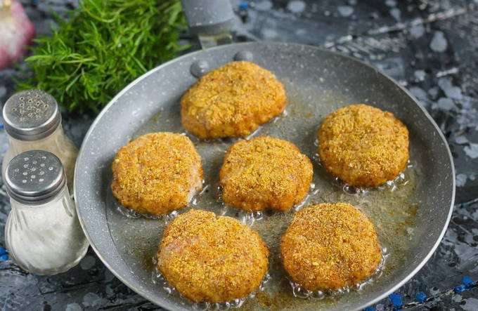We maken schnitzels van de afgewerkte massa. We brengen ze over naar een koekenpan verwarmd met plantaardige olie. Bak aan elke kant minimaal 5 minuten.