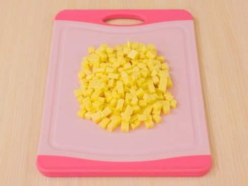 - Verdeel een stuk harde kaas in kleine blokjes.