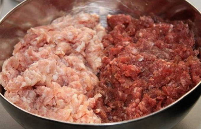 - Doe het gehakt en varkensvlees in een grote kom. Beide vleesproducten moeten vooraf worden ontdooid.