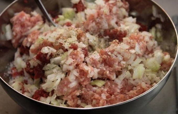 - We dompelen het varkensvlees en het gehakt onder in een kom die handig is om te kneden. Ook fijngesneden uien sturen we hier naartoe.