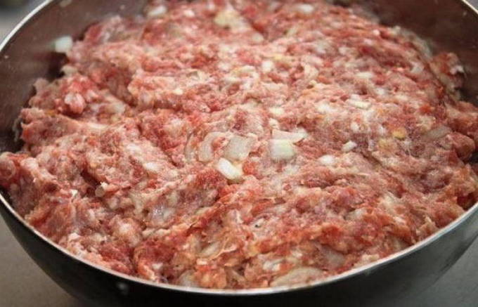 - Doe het ontdooide gehakt in een aparte kom. Voeg de pulp van een brood, gemalen peper en zout eraan toe. Kneed de massa met je handen tot een gladde massa.