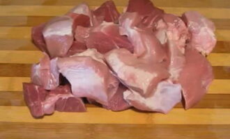 - We wassen het varkensvlees onder stromend warm water, drogen het een beetje. Snijd het varkensvlees in kleine stukjes. We voegen het toe aan de boog.