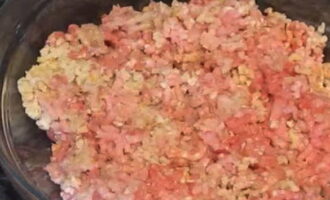 - Om te voorkomen dat koteletten in de oven uiteenvallen, voegt u havermout toe aan het vlees. We mengen de inhoud.