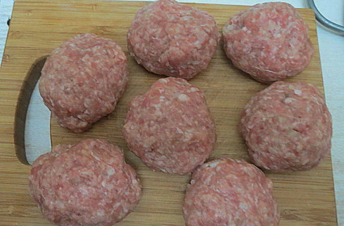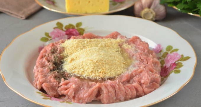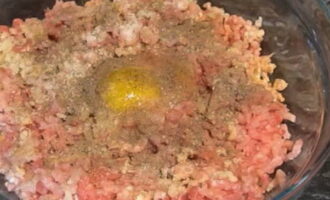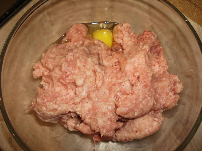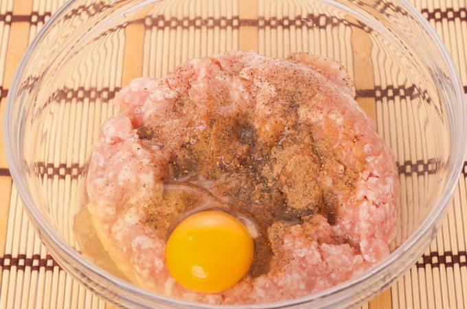We nemen een stuk brood en weken het in melk in een aparte kom. Voeg het toe aan het gehakt. We rijden daar een ei in, voegen kruiden en zout toe. Mix het mengsel voorzichtig tot een glad mengsel.