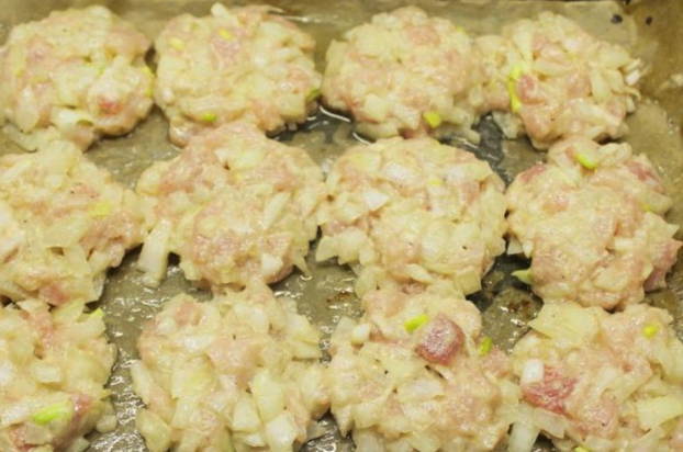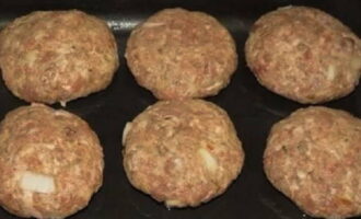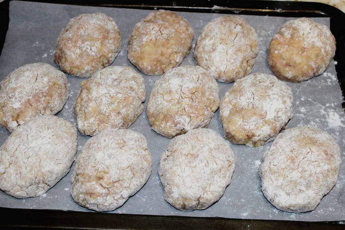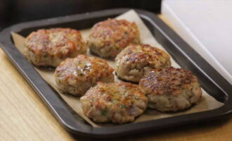 - We halen de bakplaat uit de oven en plaatsen deze op het werkoppervlak. We zetten de oven aan om op te warmen en stellen de temperatuur in op 180 graden. Leg bakpapier op een bakplaat en vet deze licht in met zonnebloemolie. Vorm middelgrote schnitzels en leg ze op een bakplaat. We verhogen de temperatuur tot 200 graden en zetten een bakplaat met schnitzels in de oven. We laten 30 minuten sudderen.