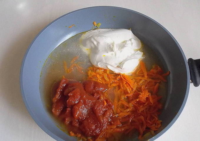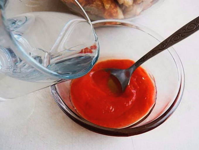 - We verdunnen de tomatensaus met water, gieten het over de groenten. Peper, zout. Dek af met een deksel en laat koken.