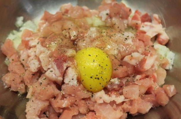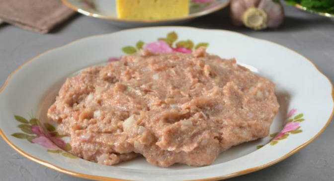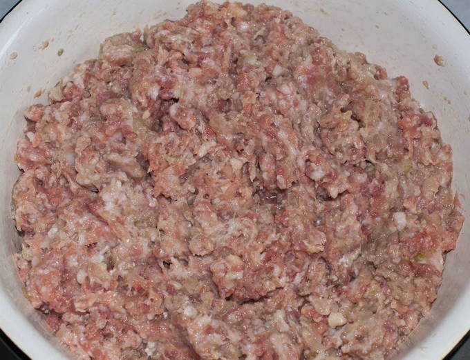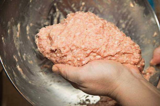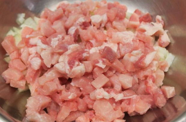 - We verwerken varkensvlees en uien: we halen het vlees van films en nerven, snijden in stukken, schillen de ui en verdelen deze in stukken met een mes, hakken beide producten tot gehakt met een vleesmolen.