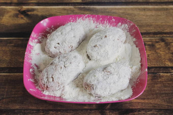 - Bedek de bakplaat met papier en vet in met olie, begin de schnitzels in bloem te rollen zodat ze niet uitdrogen in de oven.