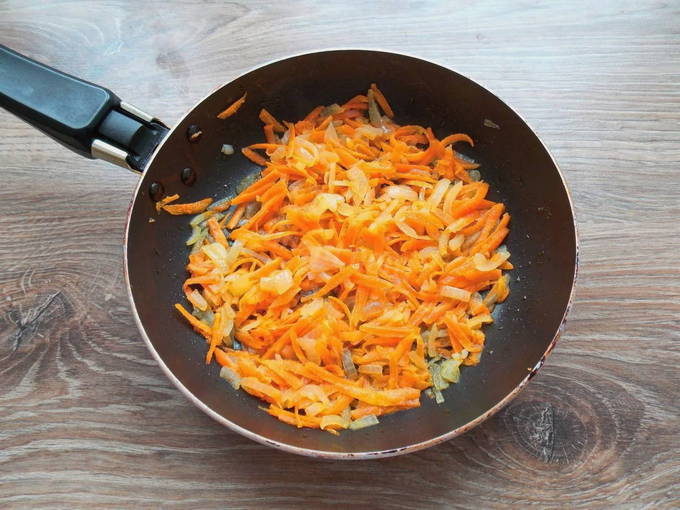 - We zetten het fornuis aan en zetten een koekenpan met olie op de brander. Wij warmen op.Voeg de ui toe en roer. Voeg wortels toe, meng een paar minuten.