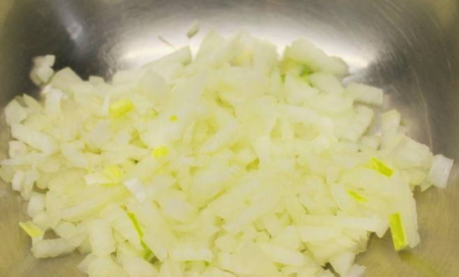 - We schillen de ui. Snijd het op een snijplank in kleine stukjes met een scherp mes. Giet in een aparte kom.