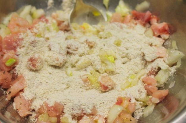 - Giet de gehakte crackers in een bord met gehakt.