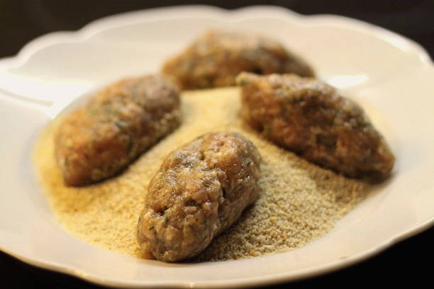 - Giet het paneermeel in een bord en begin de pasteitjes te vormen. Rol ovale blanco's in paneermeel en leg ze meteen op een bakplaat. Het moet van tevoren uit de oven worden gehaald en bedekt met bakpapier.