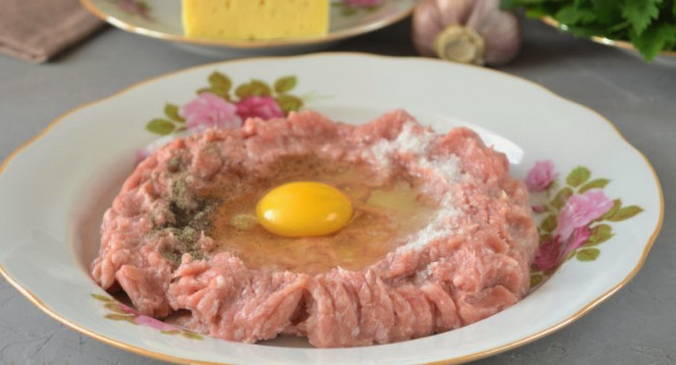 - Leg het gehakt in afgewerkte vorm op een bord.Voor het koken van schnitzels is het het beste als het zelfgemaakt is. Drijf een ei in het vlees, bestrooi met zout en peper.